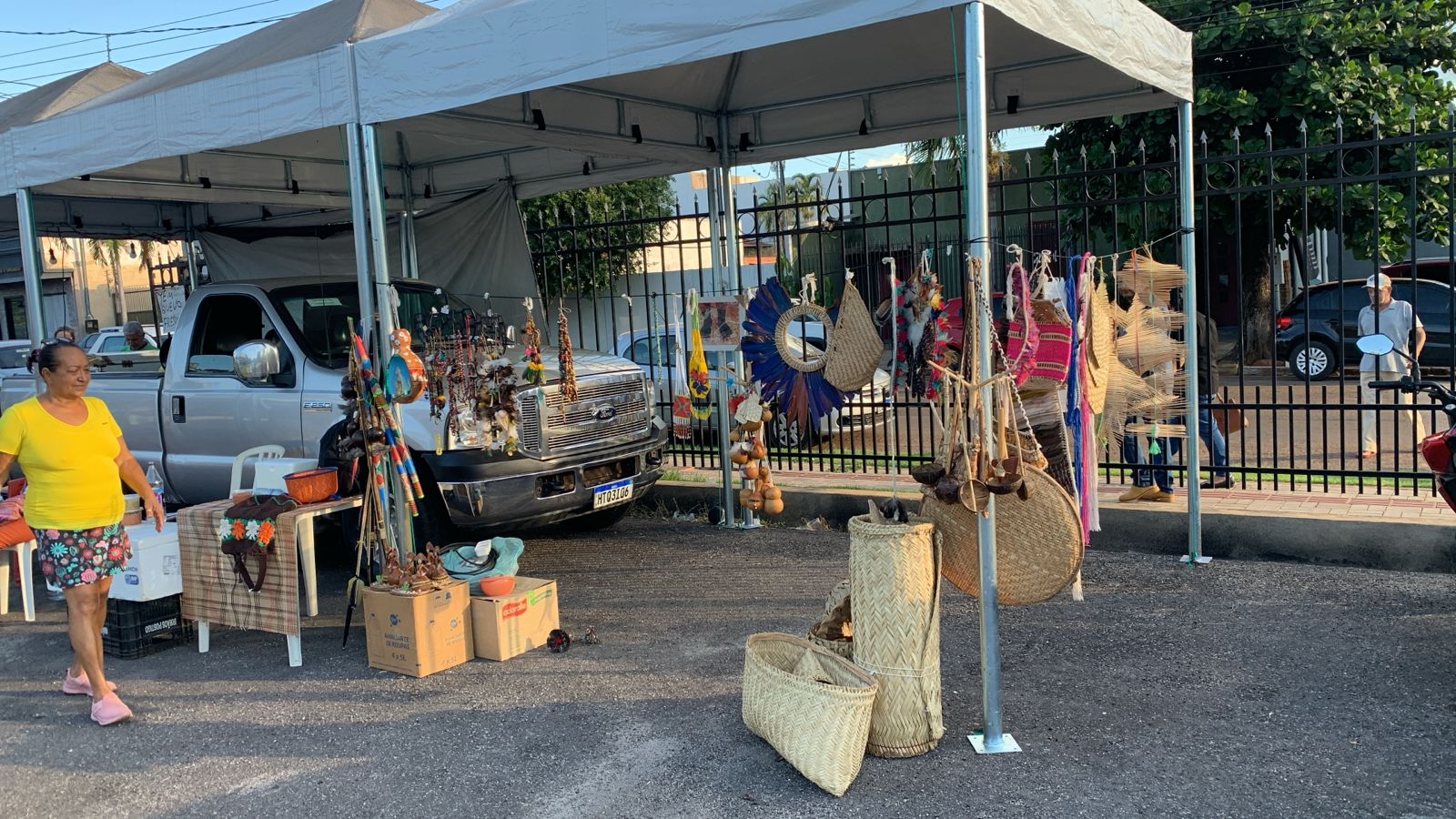 A Barraca do Artesanato Indígena fica na entrada da Feira da Vila Aurora, no portão da lateral do estacionamento.